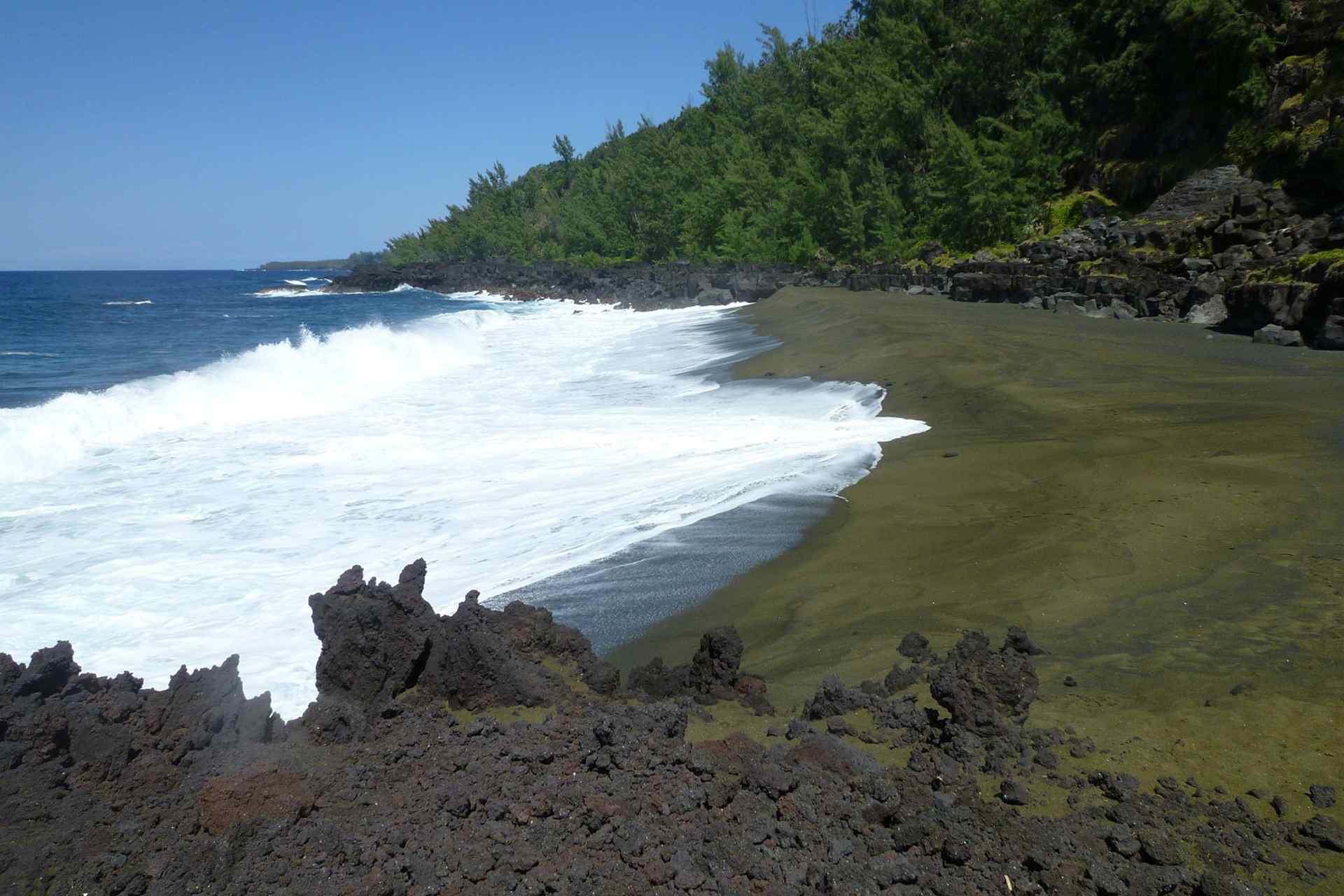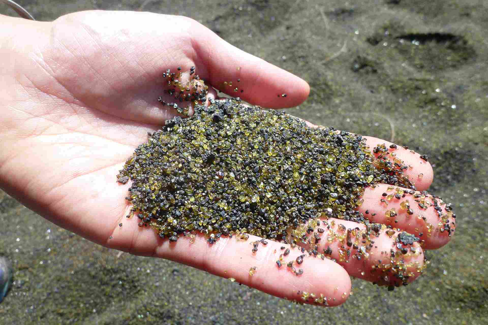 Pour la petite histoire, l’éruption du Piton de la Fournaise (volcan actif de l’île de La Réunion) a connu en avril 2007 une activité intense. Lors de cette éruption exceptionnelle, la coulée de lave (Basalte Océanite très riche en Olivine) a dévalé les Grandes Pentes, pour finir sa route dans l’océan. Au contact de l’eau, la lave s’est rapidement refroidie libérant des cristaux d’Olivine. On peut aujourd’hui observer le sable vert de la plage du Tremblet en raison de la forte proportion de cristaux de Péridot.